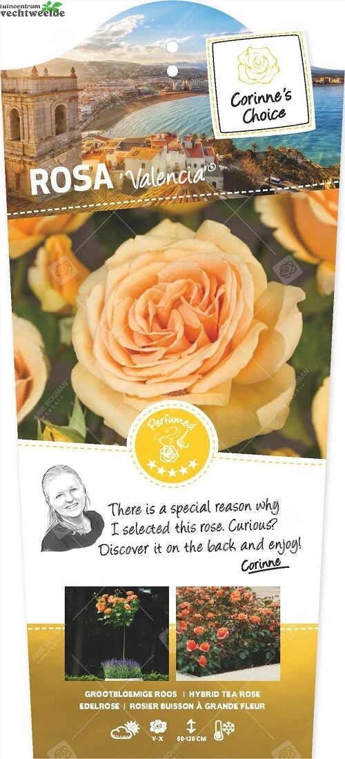 Deze roos is net zo mooi als de Spaanse stad waarnaar zij is vernoemd. De sterk geurende en zeer grote gevulde bloemen kunnen wel een doorsnede van 12 centimeter bereiken. De oranje tot abrikoosachtige bloemkleur is waanzinnig. De ‘Valencia’® brengt een beetje Spanje in je eigen tuin. Het prikkelt al je zintuigen.